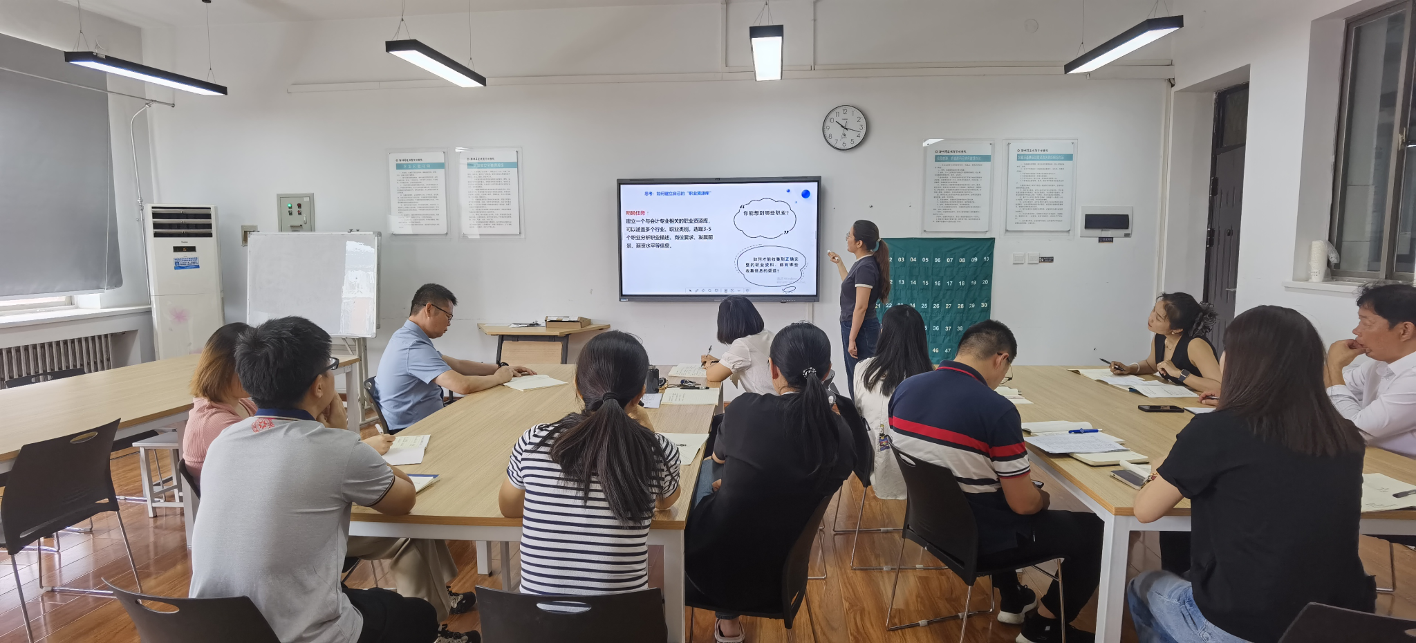首先,课程组启动了集体备课,唐新惠老师和朱阳昱老师进行了第二章课程的说课,重点从职业探索与专业结合的角度,明确了该章的课程逻辑与重点知识,帮助老师们梳理了课程内容与授课思路。