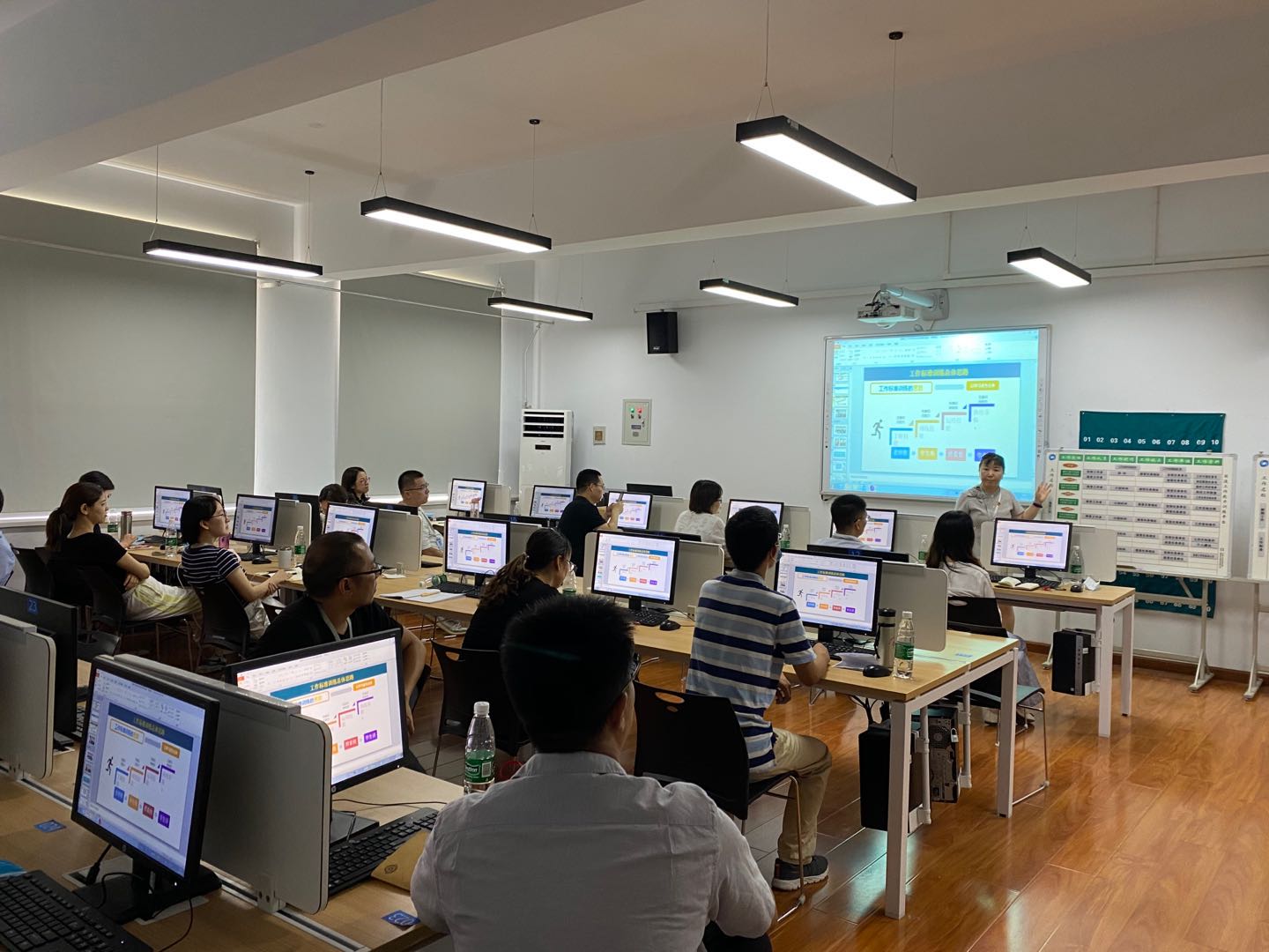 培训伊始,王民权经理通过远程视频介绍圆通制工作原理,分两个章节进行讲解,一是知行合一的工作体系,二是科学工作原理-圆通制。王民权经理“知行合一的工作体系”中指出:建设文科专业经验传承系统环境条件的重要性和培养文科人才兼具创新动力和风险意识;在科学工作原理中阐述圆通制是怎么产生的,圆通制的内涵和工作训练标准;接下来,圆通教学部教学主管李艳老师给学员们介绍,圆通制工作标准训练教学法,重点指出是“以任务为中心、以员工为主体、以老师为主导”的训练方法以及圆通制在教学中怎么应用。上午的培训中,学员们热情高涨,全神贯注,认真做笔记。