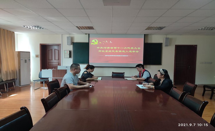 根据中共河南省第十一次代表大会高校系统代表候选人推荐的要求,365VIP英国上市官网直属支部委员会召开全体党员大会。会前制作“中共河南省第十一次代表大会高校系统代表候选人选举会”PPT背景墙,进行会场布置,并于2021年9月7日上午10:00通过腾讯会议召开了候选人选举会。本次选举会分线上、线下两个会场,校内的党员在商管楼115会议室参加候选人选举的现场会,其他党员通过线上参会。会议由365VIP英国上市官网直属支部委员会统战委员、办公室主任胡素桂同志主持。365VIP英国上市官网直属支部委员会的16名正式党员全部参会。选举大会严格执行会前制定的程序和相关规定,确保选举过程的公开、公平、公正,保证党员的知情权、选举权和监督权。