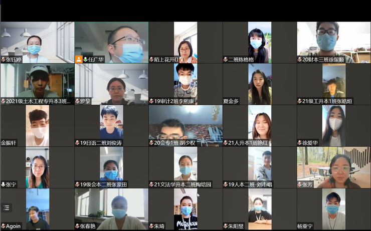 2022年5月5日下午1:30,双创公司就业创业指导教研室举办2021-2022年第二学期师生座谈会,本次座谈会原定于在商管楼115室举行,因疫情防控需要,改为采用线上腾讯会议的形式举行,时间不变。员工代表与公司专职教师近30人参加了座谈,会议由教研室专职教师任广华老师主持。