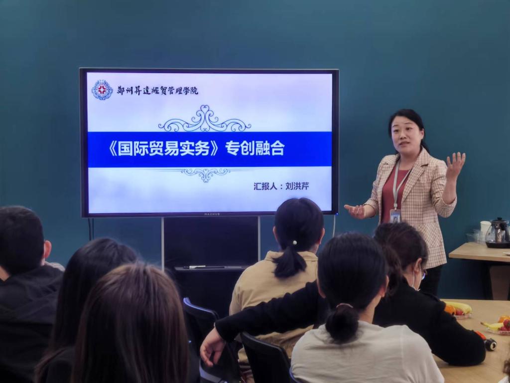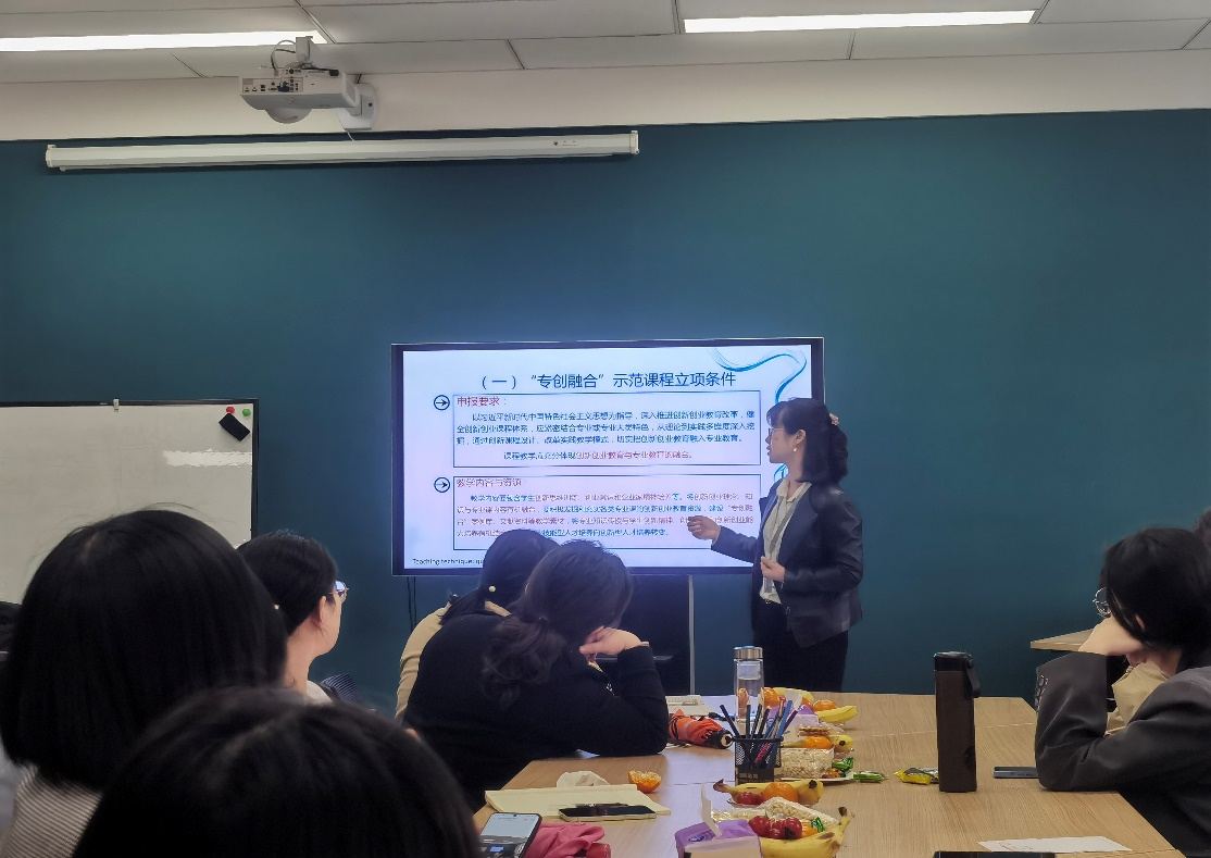 随后,由省级“专创融合”示范课程负责人、双创公司张宁老师和金贸公司刘洪芹老师分别做题为《专创融合课程建设的必要和现实可能性》、《国际贸易实务课程的专创融合思路》的经验分享。