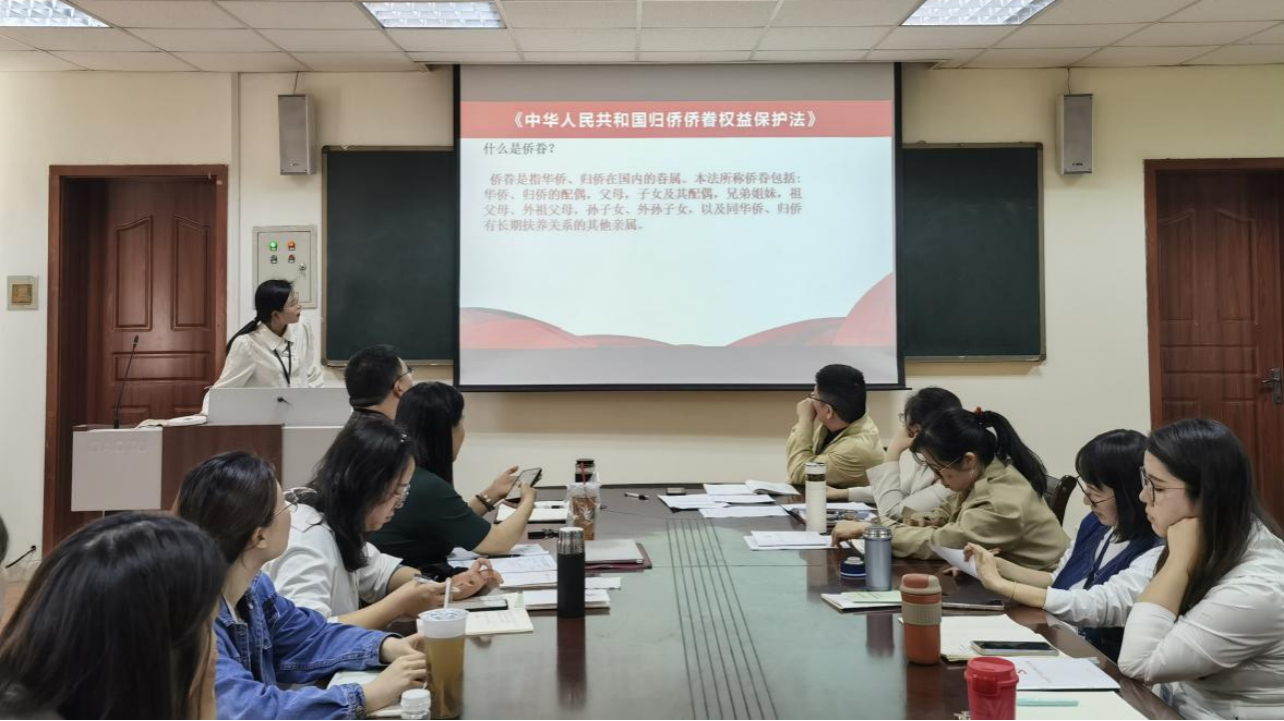 会上,对公司党委统战部《关于开展2024年“侨法进高校”主题宣传活动的通知》精神进行了传达部署,大家集体学习了《中华人民共和国归侨侨眷权益保护法》,对归侨、侨眷、华侨的身份认定、适用对象及侨胞权益等内容进行了详细讲解。