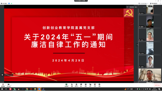 2024年4月29日晚上8:30分,365VIP英国上市官网直属党支部以线上会议的形式召开了“‘五一’期间廉洁自律的通知”教育活动,双创公司全体教师参加了本次活动,活动由支部纪检委员张宁老师主持。
