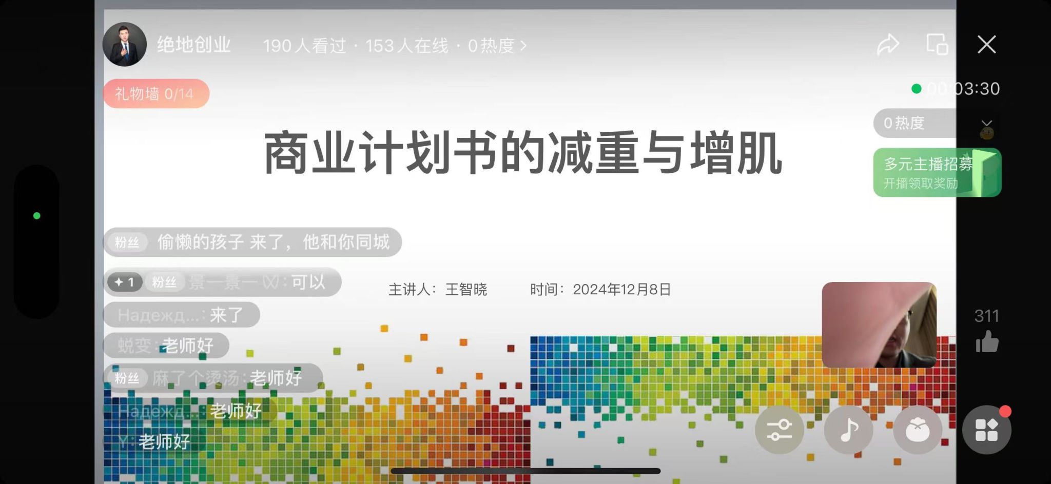 王老师凭借其在创新创业领域多年的理论与实践指导经验,以“商业计划书的减重与增肌”为主题,围绕创新思维的培养、优秀项目的来源、计划书的逻辑和结构、创新项目的策划与实施、以及案例分析等核心内容,结合筛选出的赛事重点项目情况分析,为同学们带来了一场精彩纷呈的知识盛宴。他鼓励同学们要敢闯会创,勇于探索,集合专业优势,积极利用创新工具与技术,打破传统束缚,为未来的社会发展贡献自己的智慧与力量。讲座过程中,王老师通过生动的案例分析与互动问答,激发了同学们的浓厚兴趣与积极参与。同学们纷纷在直播间留言提问,王老师耐心细致地给予了解答与指导。整个讲座氛围热烈而融洽,同学们感受匪浅,收获满满,对即将到来的校级创新大赛充满了信心与期待。