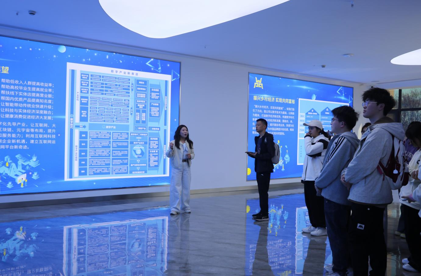 本次活动中,师生们参观了国富集团的党建基地、产品展厅、直播工作室等地,深入了解了企业的经营发展历程、党建工作成果以及电商直播的运营模式。参观过程中,同学们积极与公司负责人进行交流,探讨创业型企业的运营模式、市场推广方法以及初创企业面临的挑战等问题。此外,同学们还体验了电商直播的流程,感受到了数字经济时代的蓬勃活力。