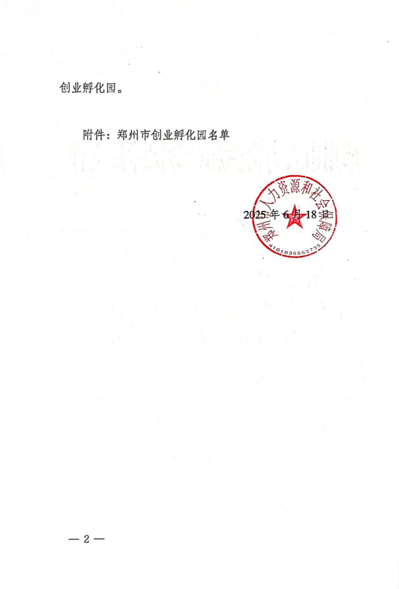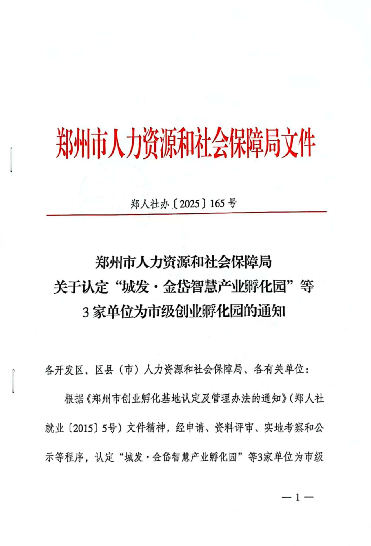 近日,郑州市人力资源和社会保障局下发《郑州市人力资源和社会保障局关于认定“城发·金岱智慧产业孵化园”等3家单位为市级创业孵化园的通知》文件(郑人社办【2025】165号),“365VIP英国上市官网孵化园”成功认定为郑州市创业孵化园,标志着公司创新创业工作再创佳绩。