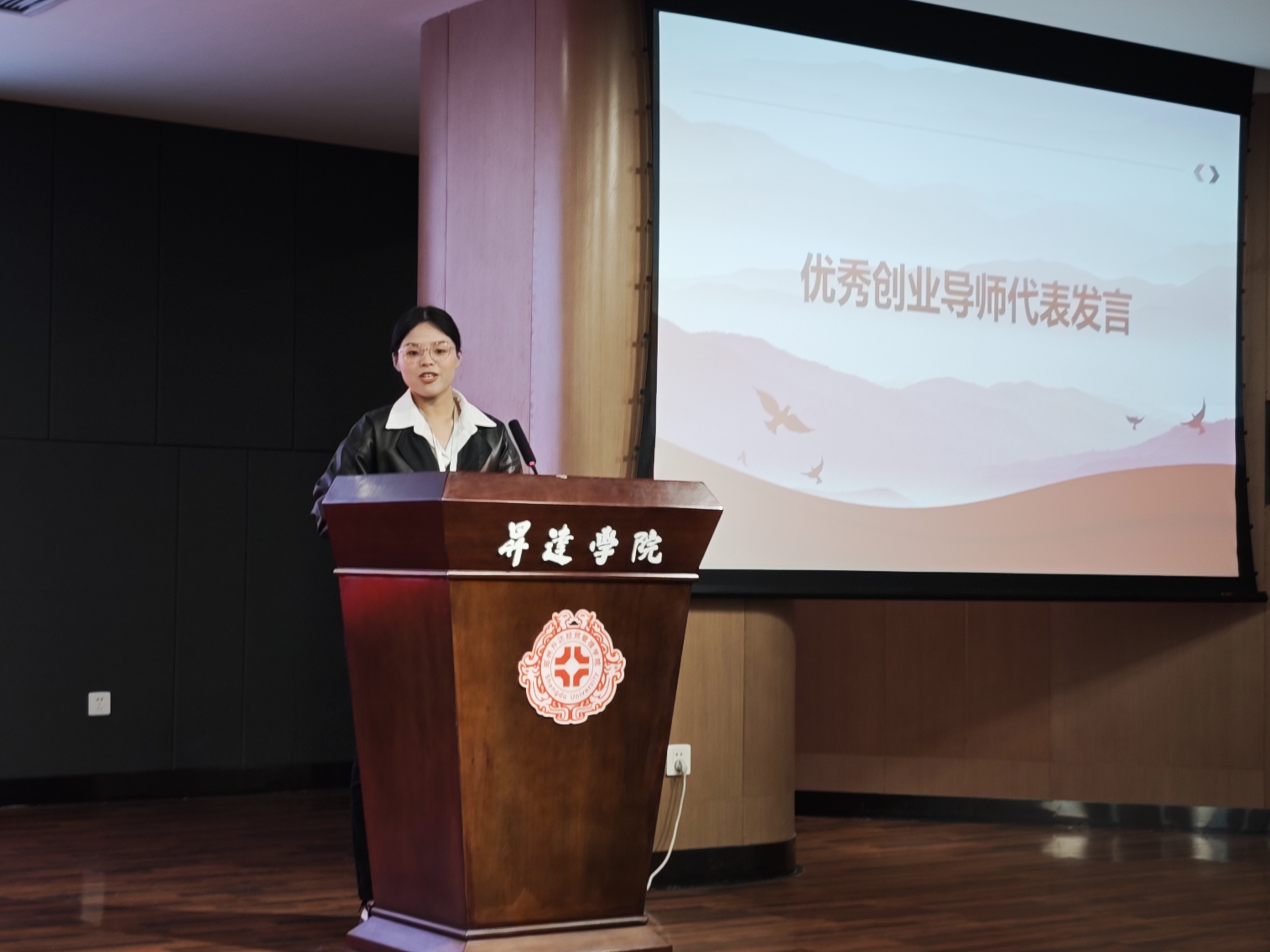 接下来,获奖导师代表贺莹莹老师上台进行了发言,贺莹莹老师以“钧瓷”项目为例,分享了创新创业项目的核心经验,她认为,双创教育不仅是传授技能,更是点燃员工勇气、培养实干精神的过程,并鼓励同学们在“领航计划”中勇于尝试,让有价值的创意生根发芽。