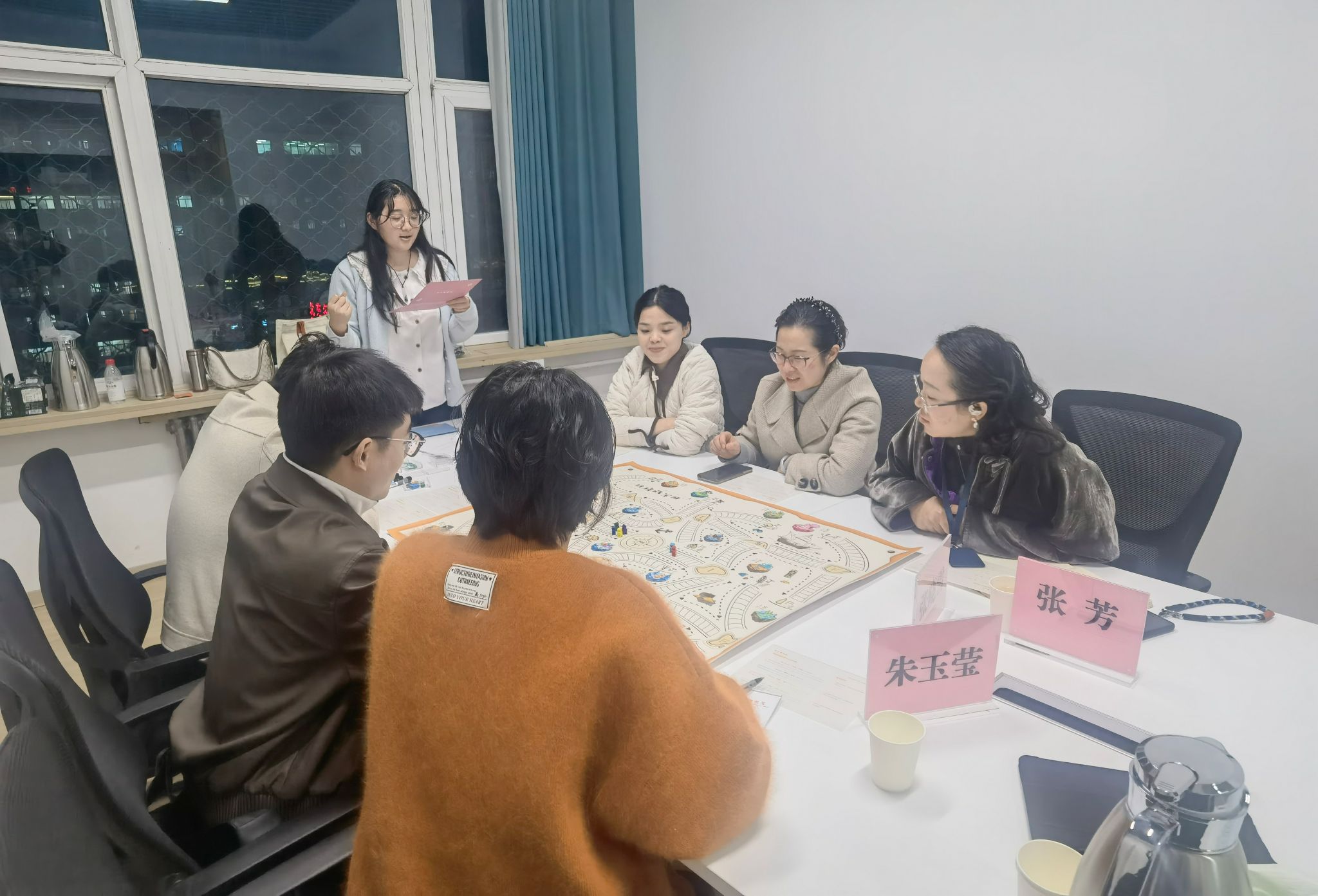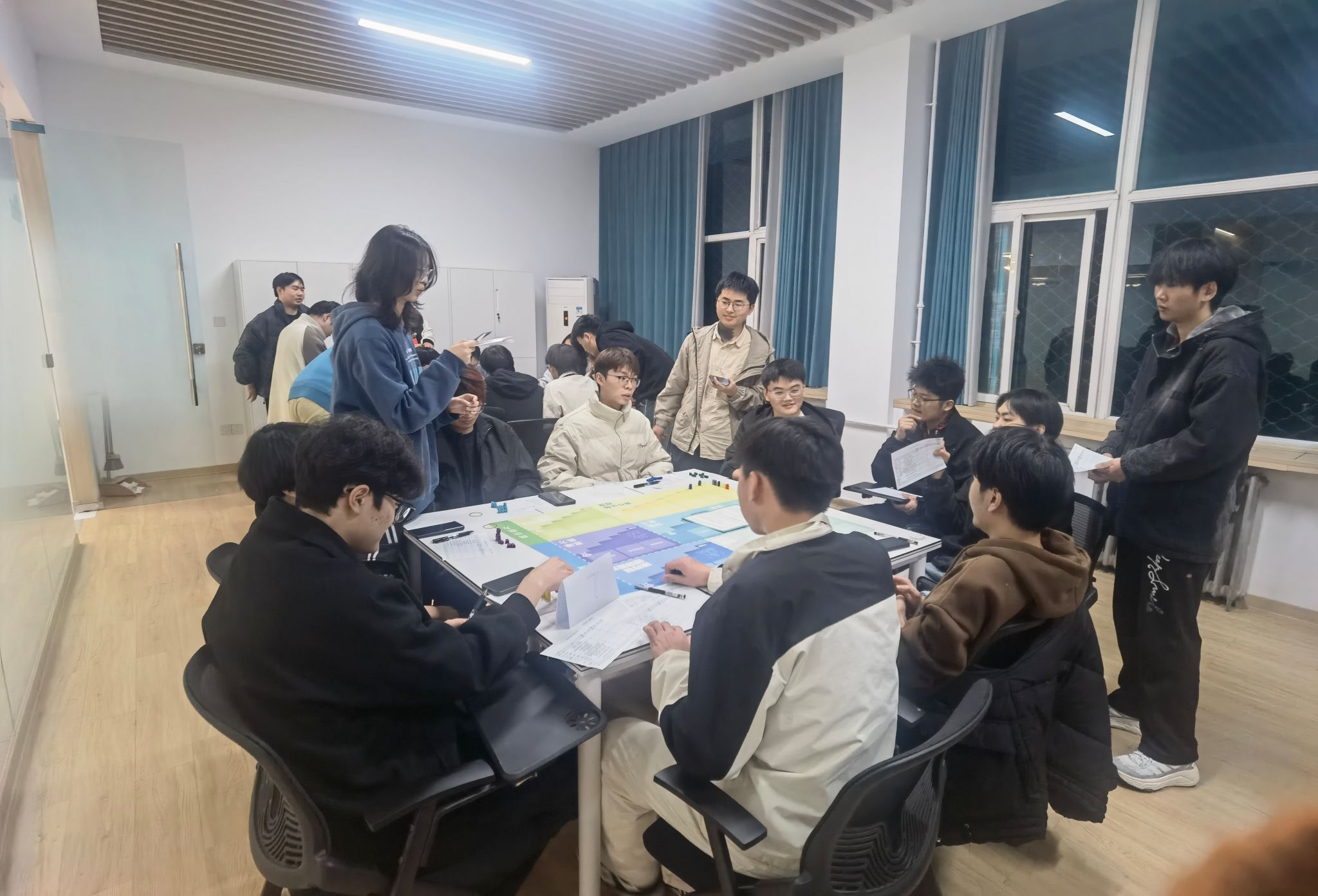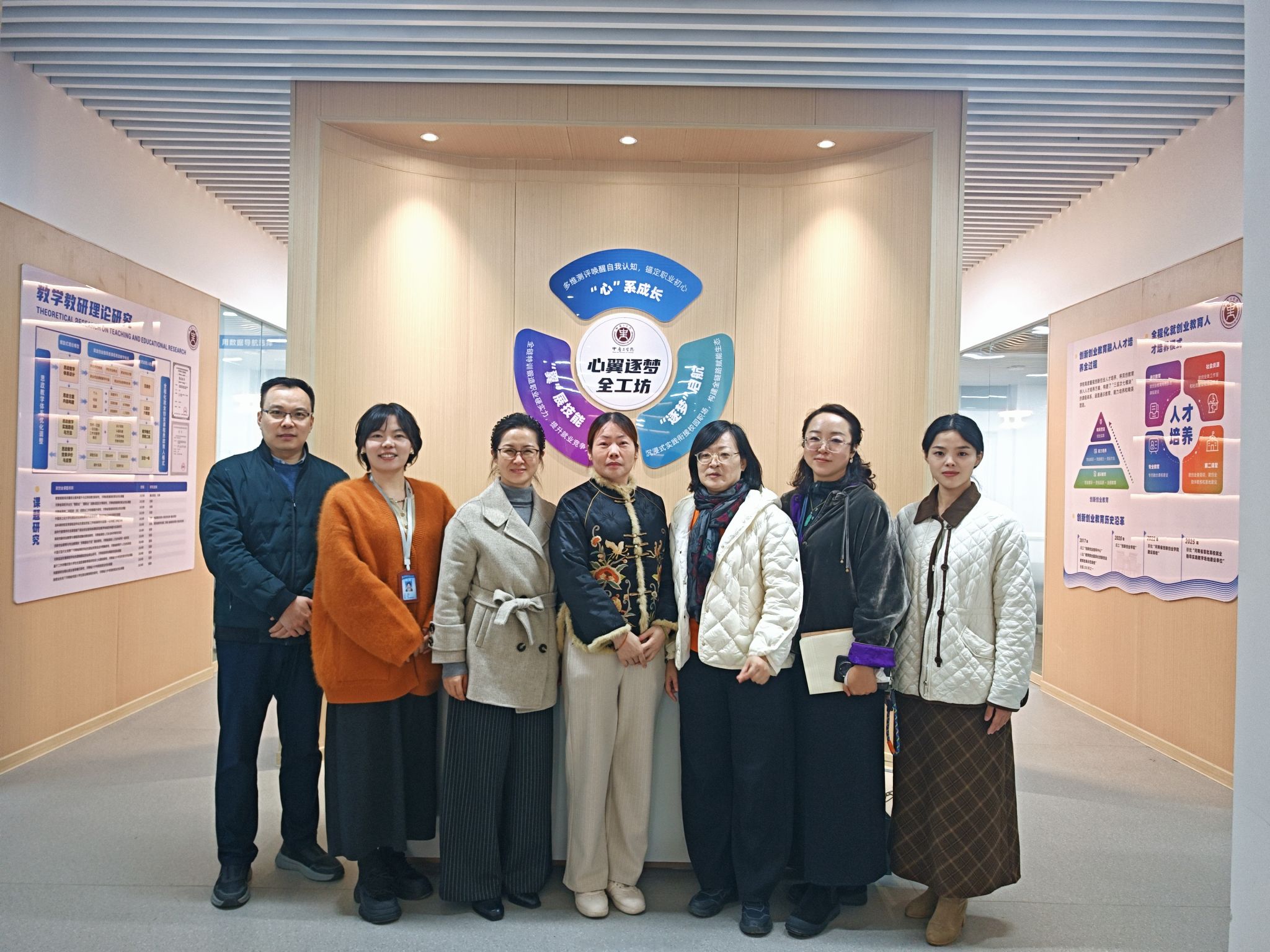 随后的座谈交流会上,陈经理系统分享了该校双创教育的发展过程及成果。首先是课程建设方面,从2008年至2025年的不断探索,形成了通识必修课+交叉模块课+特色训练营相结合的特色课程体系,也为各公司的大创赛项目提供了多维孵化基础;其次是教学改革,从传统授课到实践化改革,双创教学逐步从普通教室转移至实践基地,在实践改革探索中,基地也紧跟数字化要求引入AI作赋能,如AI面试仓、AI职场礼仪智能镜等。相关负责人特别强调,公司始终以成果转化为导向,通过深化产学研融合为双创教育注入持续动力。随后,为了让调研团队更好的感受中原工实践化改革形式,陈经理组织调研团队现场进行了一场职业自我认知的沙龙,活动生动有趣,调研团队表示受益匪浅。