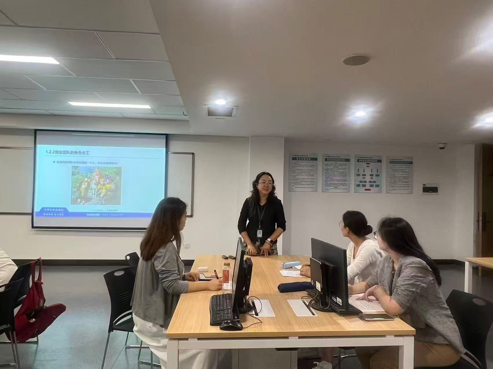 2025年10月22日,就业创业指导教研室《老员工创业基础》课程组在商管楼114教室举行专题教研活动,聚焦“产品设计”教学创新与课程建设任务推进。会议由课程负责人张芳老师主持,全体教师围绕产品设计教学融入路径及学期重点工作展开深入研讨。