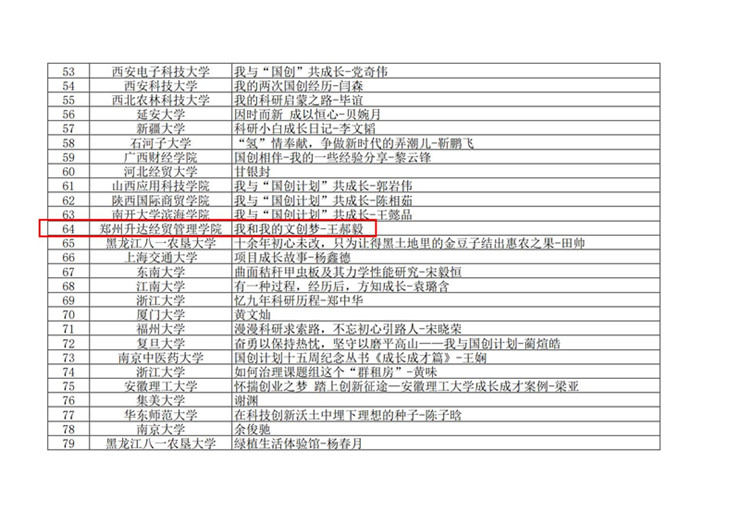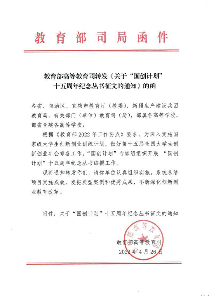 近日,教育部高等教育司转发《关于“国创计划”十五周年纪念丛书征文的通知》的函,公司选送的、由会计公司王郝毅、高雪儿同学撰写的《我和我的文创梦》成功入选《成长成才篇》;同时,根据教育部高教司的意见,参加第十五届国创年会期间开展的“我和国创共成长”——成长成才故事线上联讲活动。