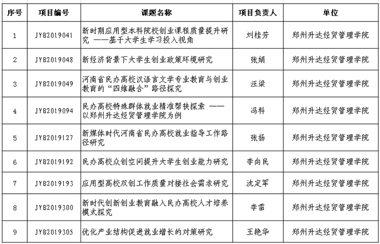 近日,河南省教育厅下发《关于公布2019年度全省大中专院校就业创业课题、论文评审结果的通知》(教学〔2019〕492号)。2019年度课题,公司共立项9项,本次申报属限额申报,公司限报10项。同时,2018年课题,公司顺利结项8项,其中,6项获奖:分别为,一等奖2项,二等奖3项,三等奖1项。另外,2019年度就业创业论文评选,公司获三等奖1项。