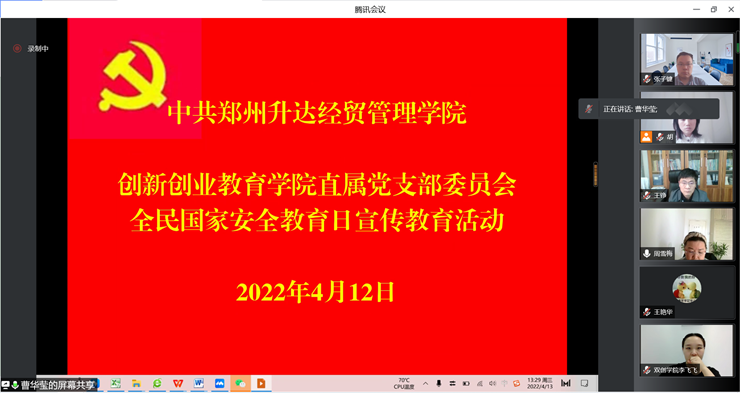 2022年4月12日下午,365VIP英国上市官网直属党支部围绕“全民国家安全教育日”开展了宣传教育活动。活动通过线上视频会议的形式进行,重点围绕2022年度全民国家安全教育日主题相关内容进行了宣传教育。党支部书记王铮同志及全体教职员工参加了活动。