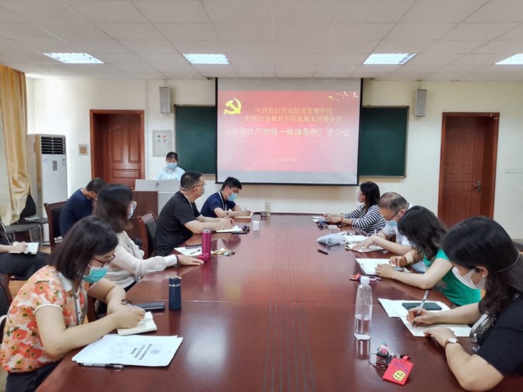 2022年6月10日下午,双创公司直属党支部组织召开《中国共产党统一战线工作条例》专题学习会,全体党员和教职工参加会议。会议由支部统战委员周雪梅同志主持。