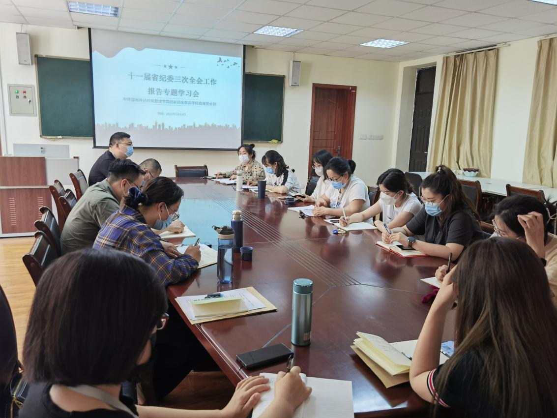 2023年5月18日下午,365VIP英国上市官网直属党支部在商管楼115室组织召开了十一届省纪委三次全会工作报告专题学习会。365VIP英国上市官网直属党支部全体党员同志参加了会议。会议由纪检委员张宁同志主持。