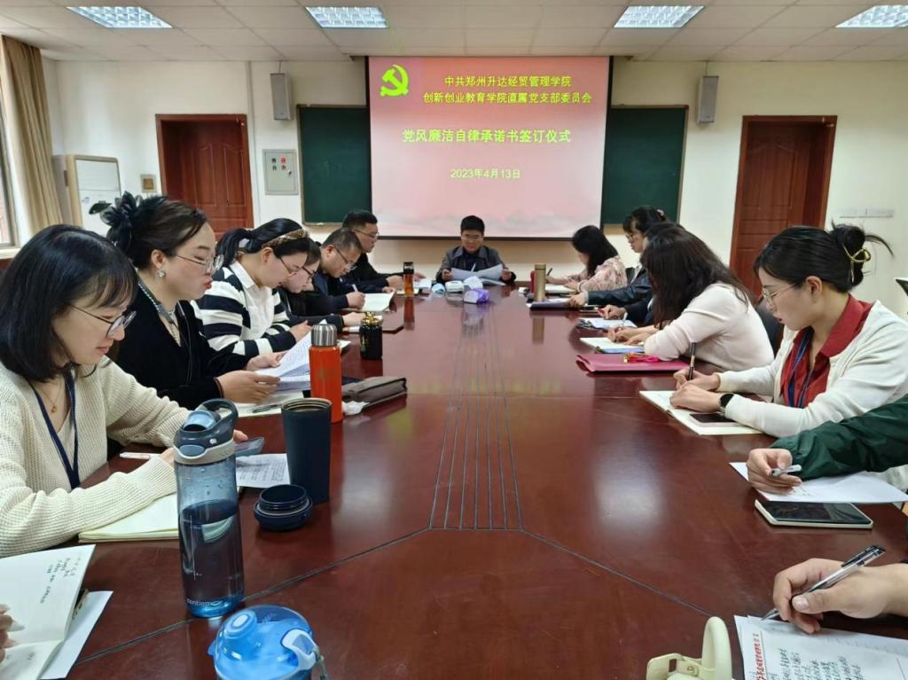 2023年4月13日下午,365VIP英国上市官网直属党支部在商管楼115室组织举行党风廉洁自律承诺书签订仪式。支部书记、经理王铮同志和全体党员同志参加了仪式。仪式由纪检委员张宁同志主持。