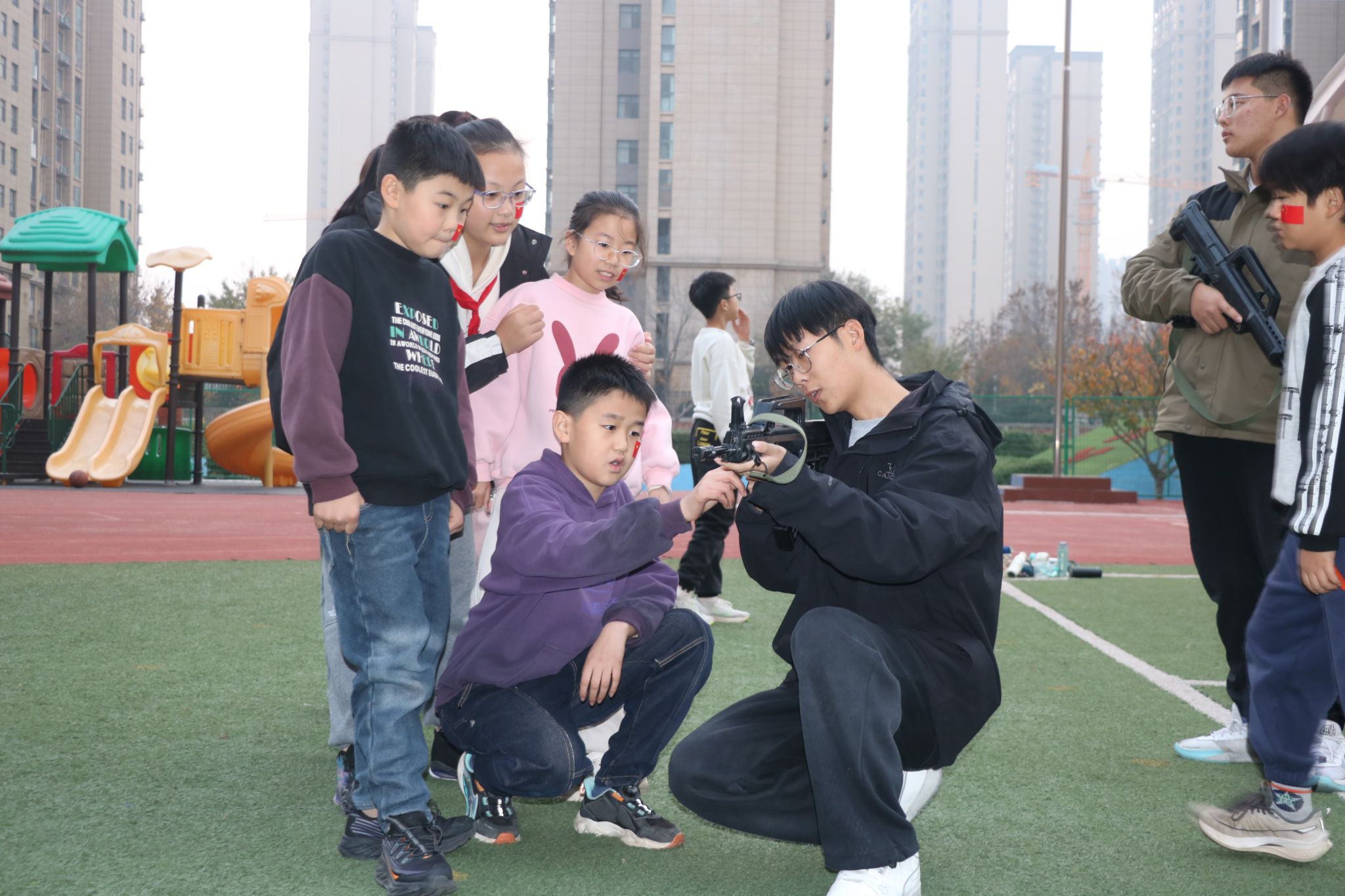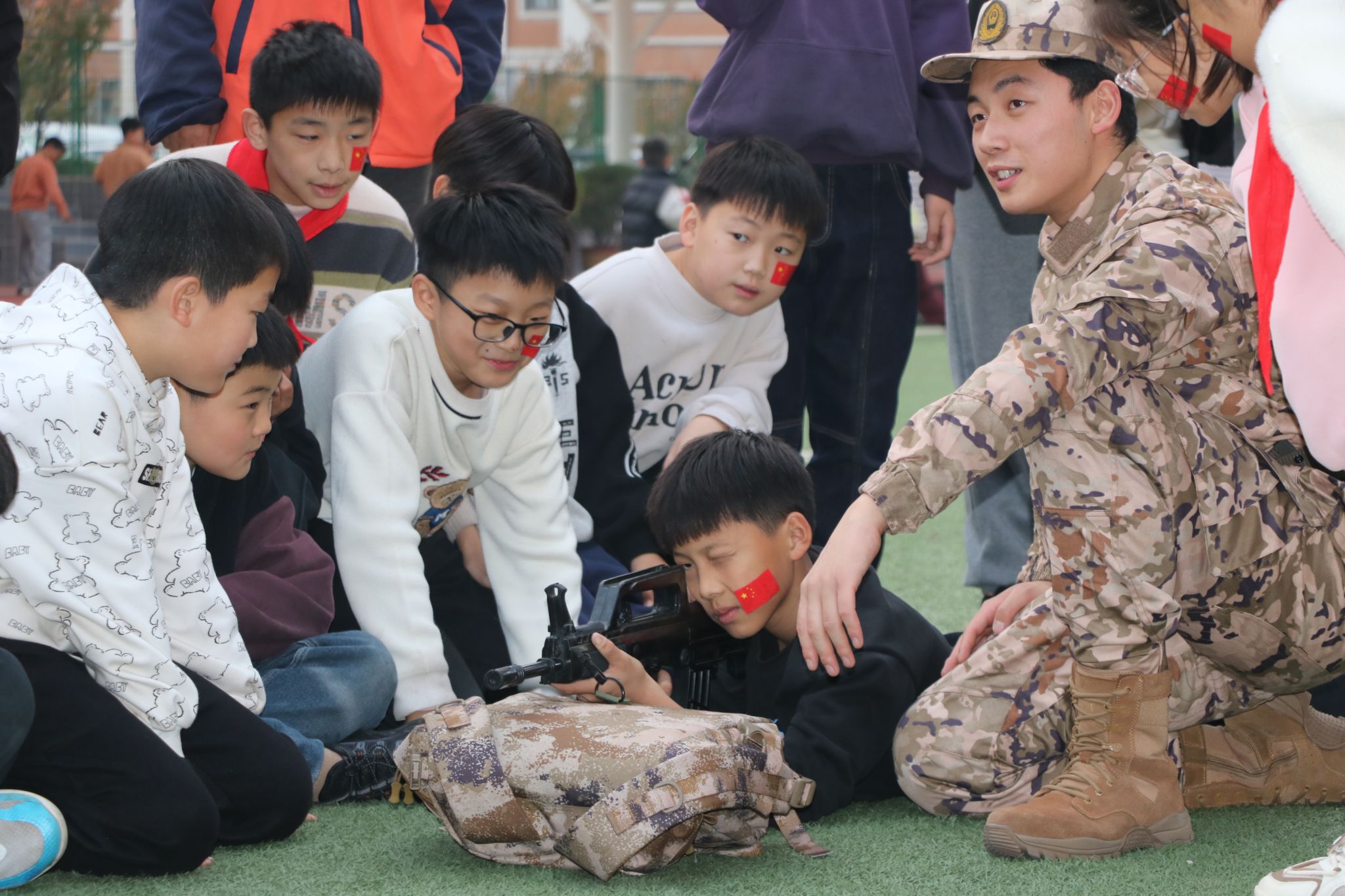 本次活动主题为“爱国军事教育”,由“领航计划-达智营”“尖兵领航 青春铸魂”项目团队主导。在活动过程中,团队成员向小员工们展示了军事装备模型,带领小员工们体验了模拟“打靶”,组织大家一起唱红歌、做游戏。升达附小的小员工们在大哥哥、大姐姐的组织带领下,踊跃参与活动,积极提问,度过了一段兴奋、开心、有意义的时光。
