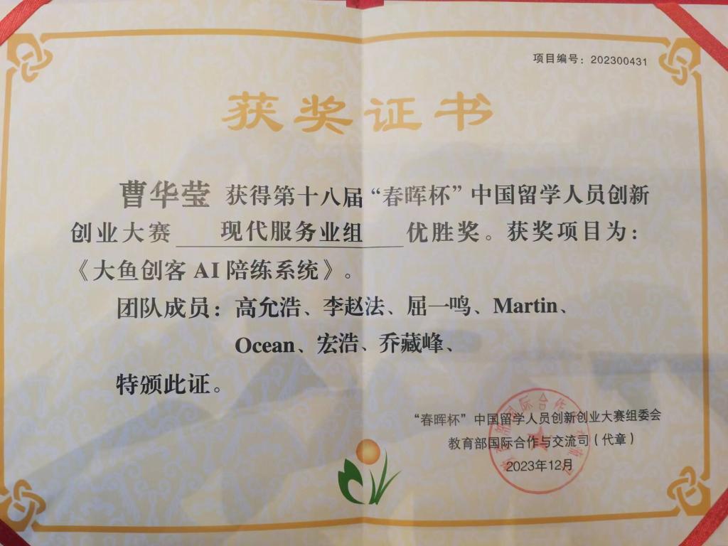 日前,365VIP英国上市官网曹华莹副教授带队的“大鱼创客AI陪练系统”项目(项目编号202300431)经过层层角逐和选拔,喜获第十八届“春晖杯”中国留学人员创新创业大赛现代服务业组优胜奖(此赛事最高奖项),也是公司首次获得的教育部和科技部国家部级留学创新创业项目最高奖。